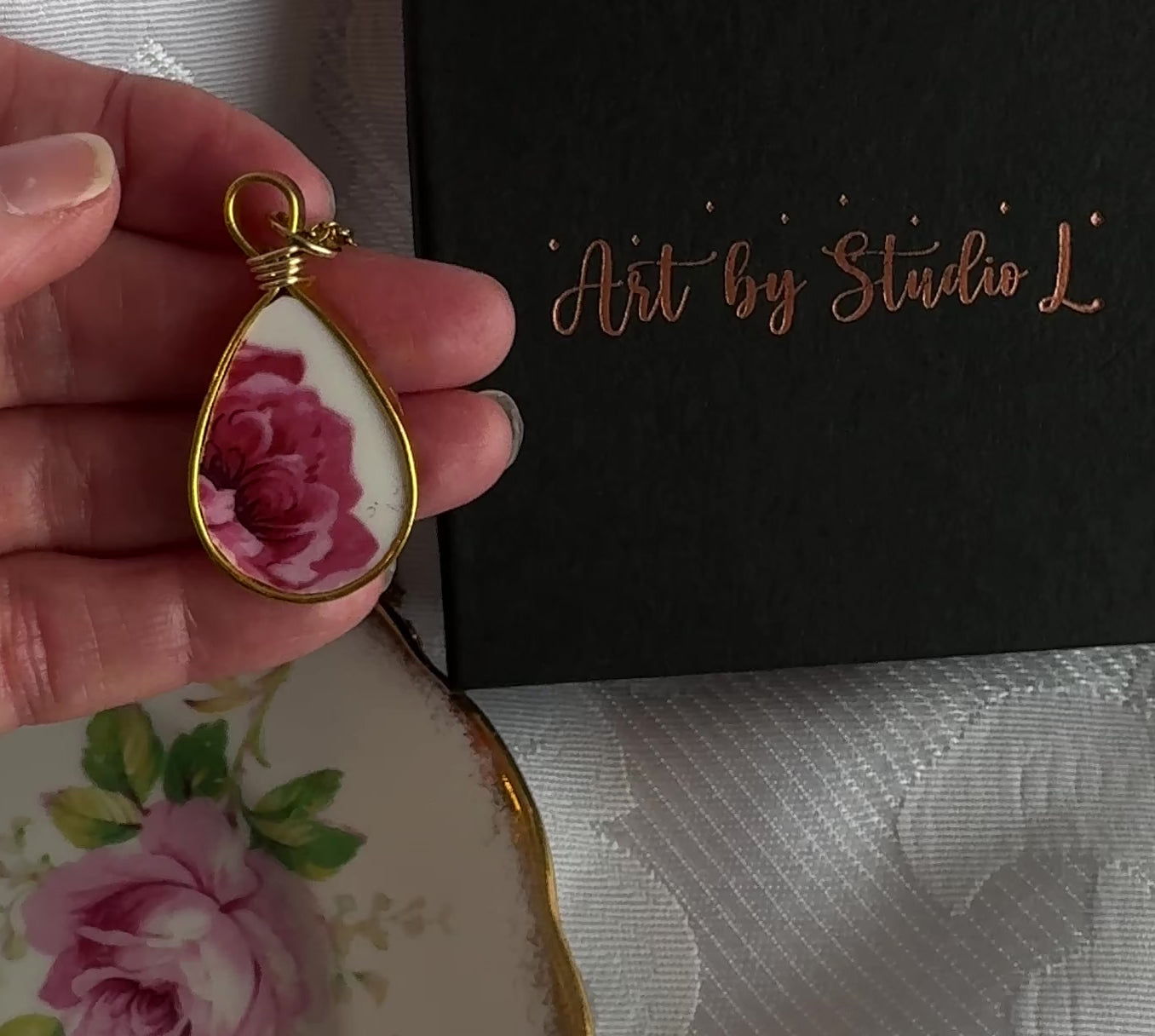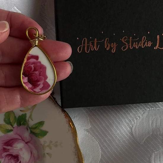 The teardrop shape does something interesting to this piece. The china fragment inside it is small, and the rose it holds is seen from an unusual angle, the deep crimson centre right at the bottom of the frame, lighter pink petals fanning upward and outward toward the gold wire. It feels like looking into a bloom from underneath, which isn't something you'd normally think to do.